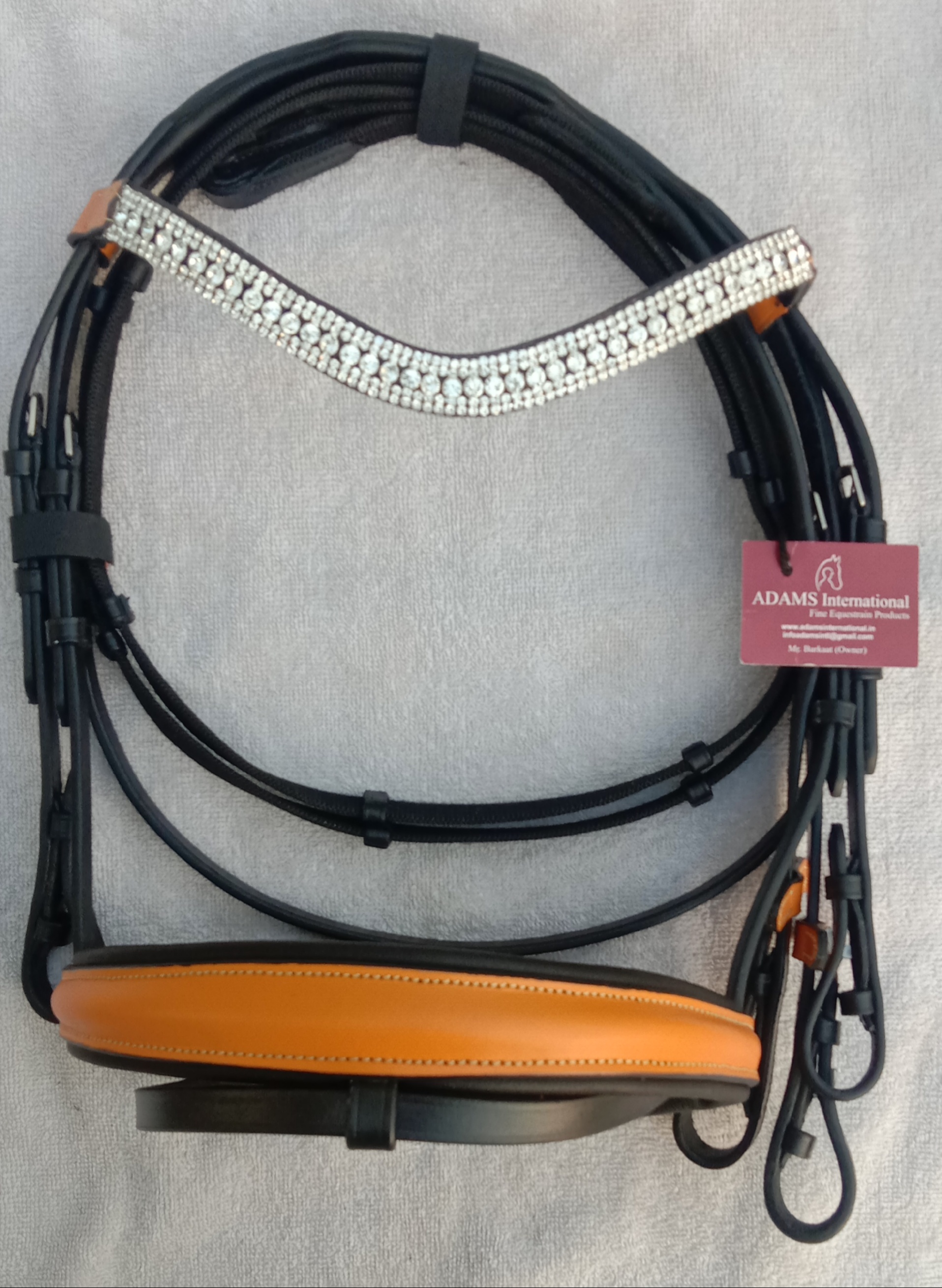 Fit to all horse availabble in all size.<br><br>Comfort Crown Dressage Bridle is designed so that only soft padding touches your horse. Crafted from leather, it features a traditional crown and padded noseband with flash. A straight chain and crystal accented browband adds sparkle.This simple and elegant raised dressage bridle with flash features a single crown design and Indian-inspired buckle ends.